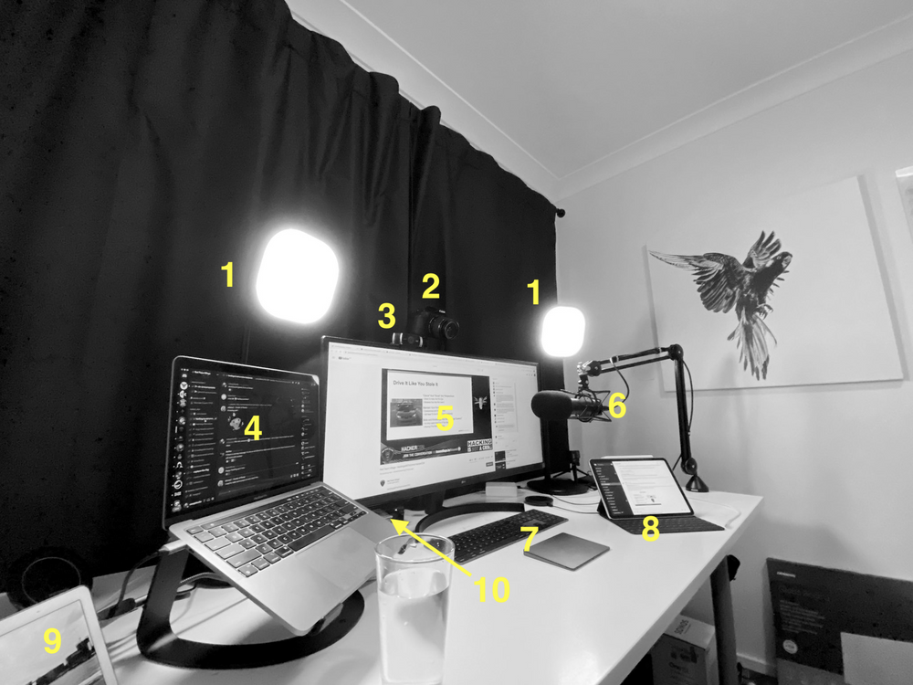 - Two Elgato Key Light Airs. These are great lights; they throw a wide and smooth light and are easy to position to avoid glare in my glasses without throwing shadows. They are wi-fi controlled for brightness and color temperature. The wi-fi control relies pretty heavily on mDNS (so that, for example, the Elgato app on your iPad knows they are there). Don't be surprised if you need to restart the app occasionally, especially on a non-flat home network.