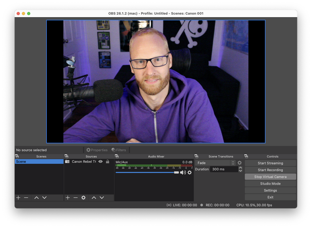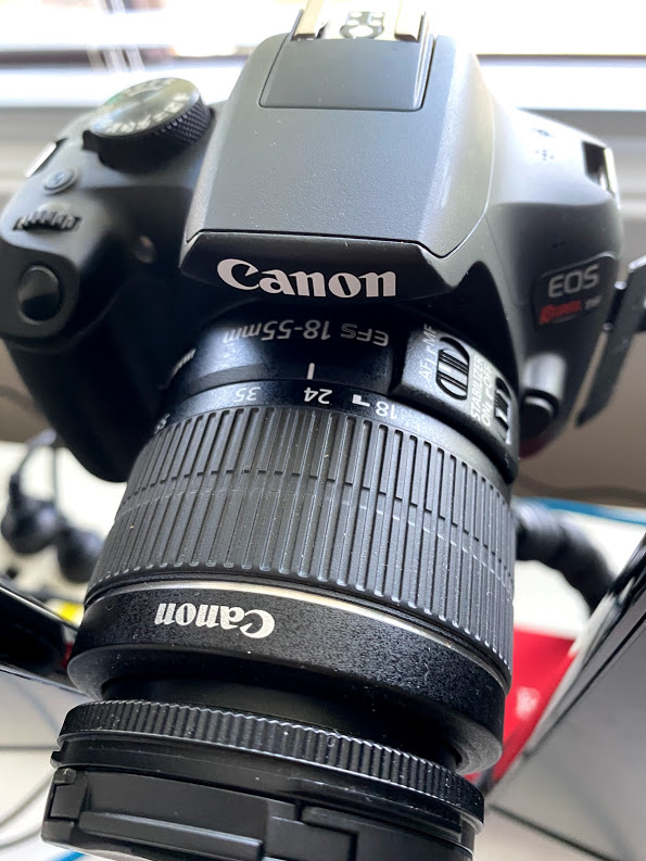 - Canon Rebel T6/1300D with the stock kit lens on an Elgato Master Mount L. We brought the Rebel with us but found that we really weren't using it much in preference to phone cameras and the like, so I started playing with it as a part of the office setup. It's not an expensive DSLR or lens, but the amount of "glass" compared to a webcam makes a HUGE difference to color, contrast, and picture detail, and does so that survives any downsampling or codec atrocities committed to the image by the like of Zoom or Google Meet. To get from the camera into streaming/video software, it's a USB cable into a Satechi Mini Hub, which talks directly to the Canon webcam driver on my laptop. For some reason, this driver and video conferencing software don't play nice, so it goes into and out of OBS using the virtual webcam driver. Setting things up in this way also allows fun stuff with OBS in real-time, although I haven't played with this yet.
