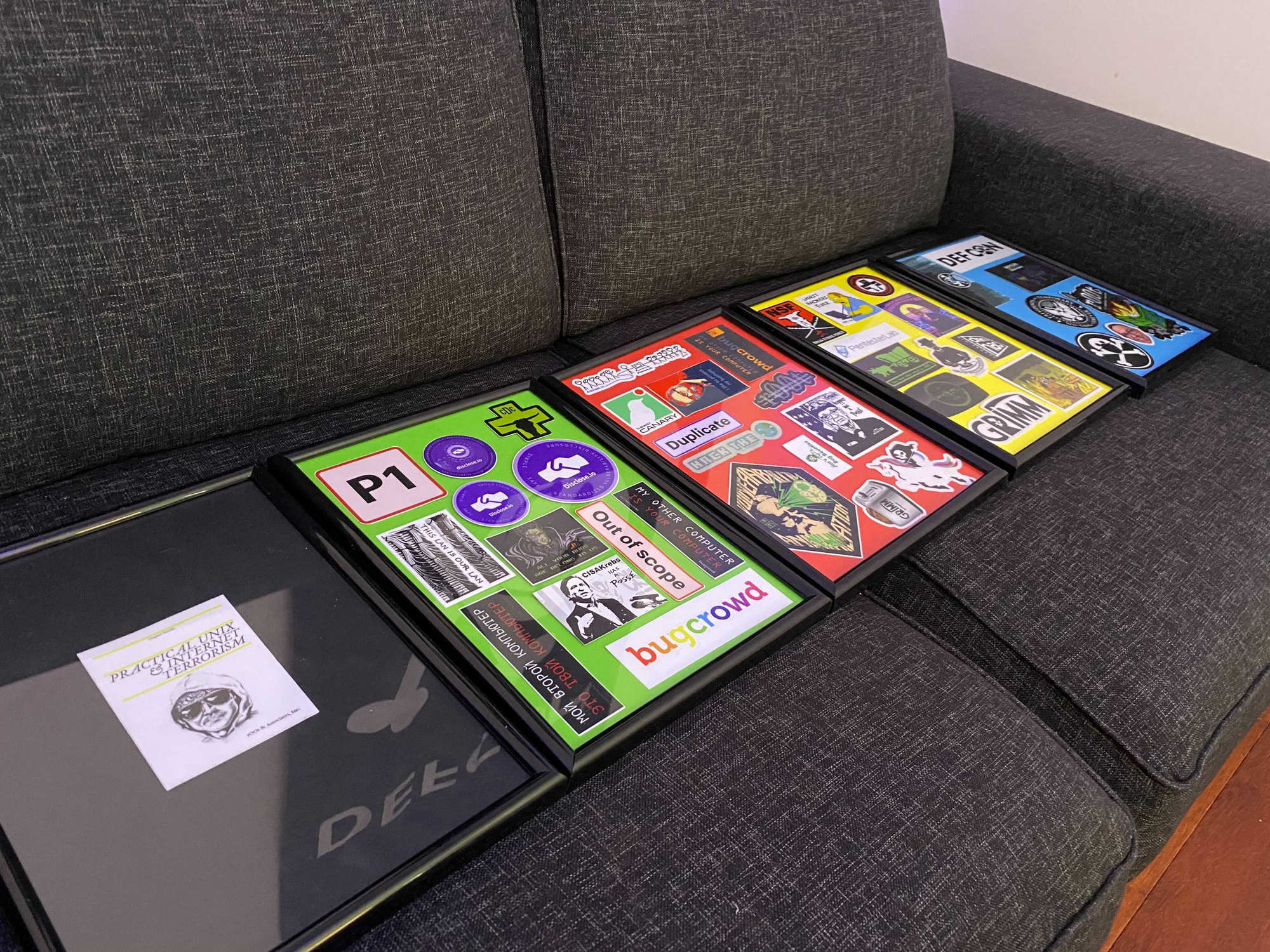 - Crikeycon poster and sticker collection. Crikeycon was my first keynote for 2021, the first time at an IRL conference in 12 months, and the first time I'd gotten to meet a lot of the newer Australian Bugcrowd team in person - It was pretty special so that one gets a spot on the wall. The stickers (to the left down the side) were an idea my wife had to blu-tack, vs. stick, stickers which I value to a paper backing and put them in the picture frame... Genius right?