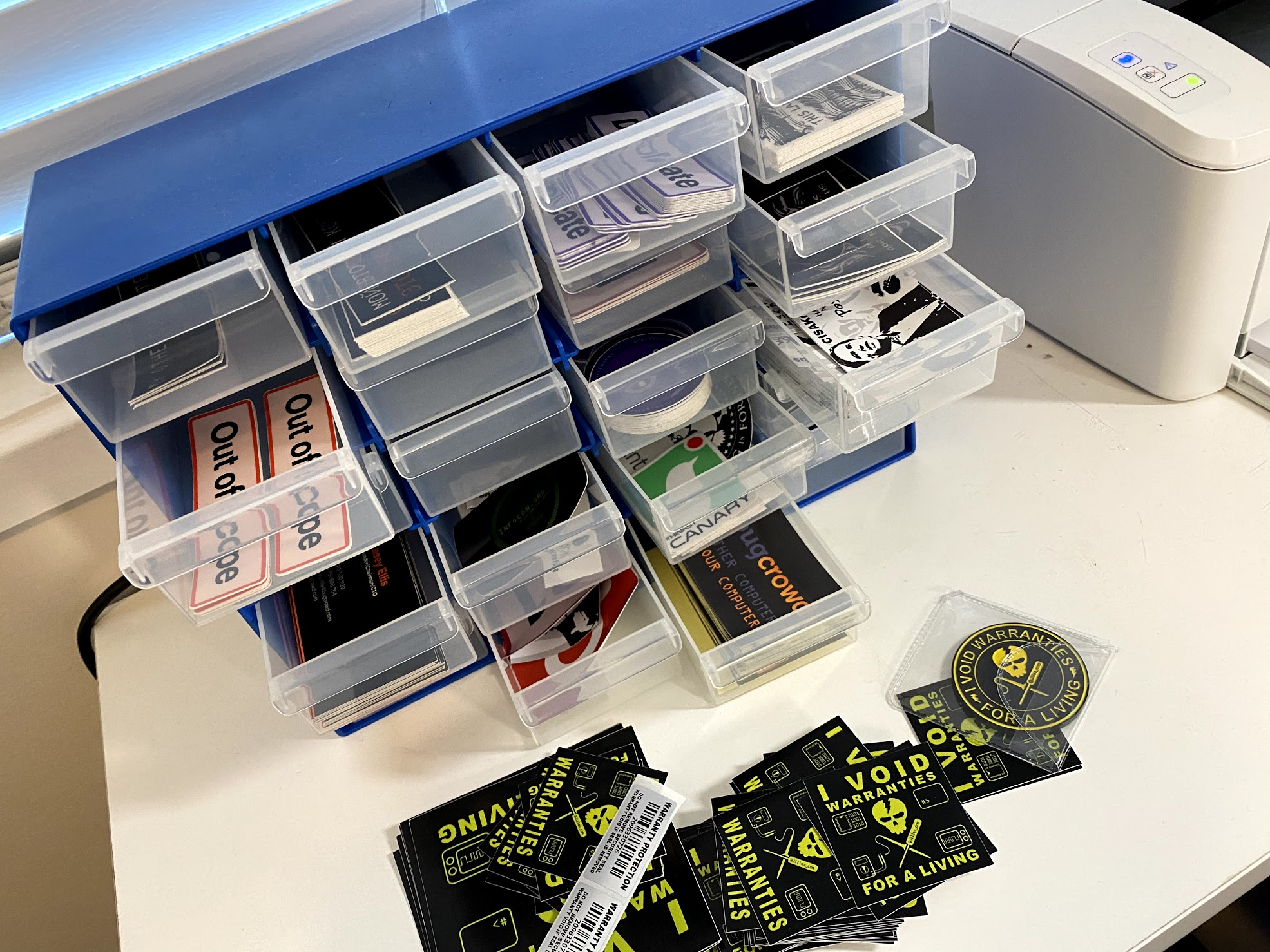 - Plastic 4x4 component drawer. One of the things I, somewhat weirdly in hindsight, grabbed and packed before we left for Australia was as many Bugcrowd and disclose.io stickers that I could find. I've been sending them around to folks over the past year and getting some lovely swag and paraphernalia in return... Kind of a "virtual sticker swap" in place of conferences - Getting unexpected gifts in the mail has been a neat little source of joy for me during the pandemic, and I know it has had a similar impact of folks I've sent stuff to. Anyways, all of these warm fuzzies add up to a lot of stickers, which become a bit tough to keep organized and in reasonable condition. This little box was $10 in one of those random nick-nack stores, and has competently taken care of that problem for me.