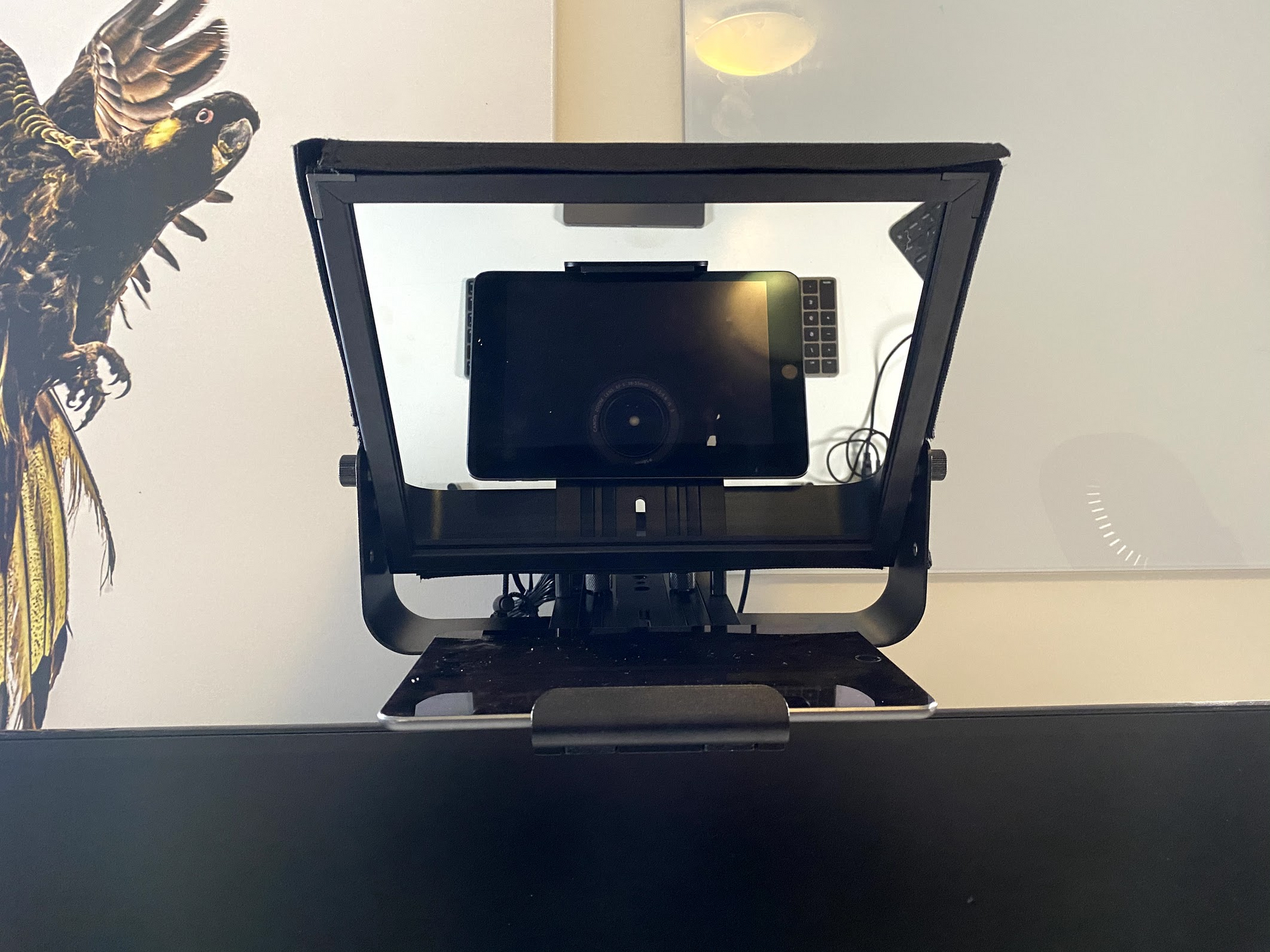 - Glide Gear TMP100 Teleprompter. You know that thing where you're presenting or on a Zoom call, and you're looking at "all the things" as you're trying to have a conversation, maintain meaningful eye contact, and engage those you're talking to? This is to help solve that problem. I looked into DIY teleprompters for a bit of fun and got that working, but I wanted a more stable and long-lasting solution, so I went for the make/model that streamer buddies like STOK all seemed to recommend. It's being fed by an iPad Mini which I send video to over wi-fi using OS X Sidecar.